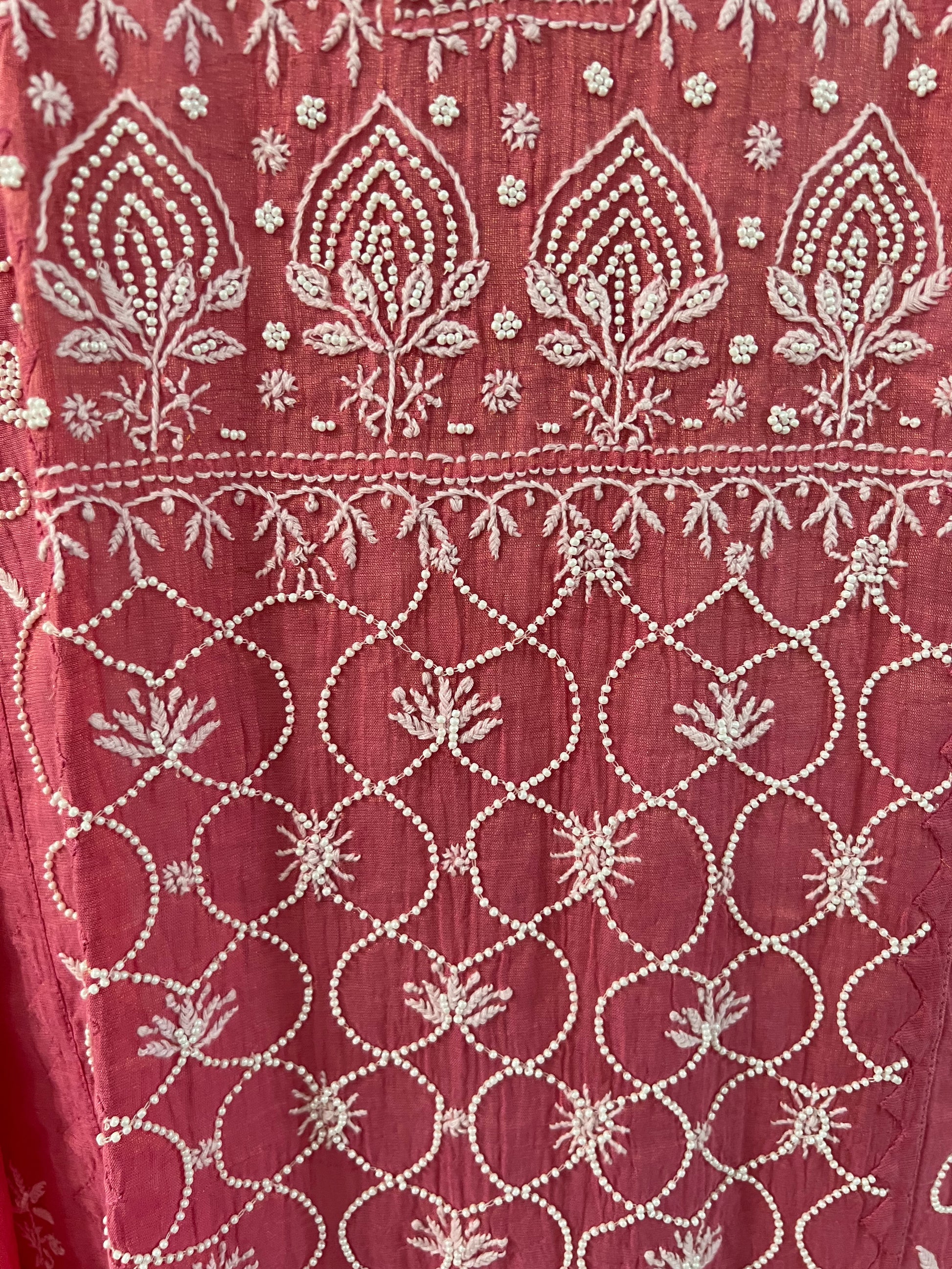 Gracefully crafted in tissue Chanderi silk, this elegant pink suit is adorned with intricate hand-embroidered Chikankari, beautifully enhanced with delicate embellishments of pearls, sequins, and cutdana. The soft sheen of tissue silk paired with subtle handcrafted detailing creates a refined, luminous charm.