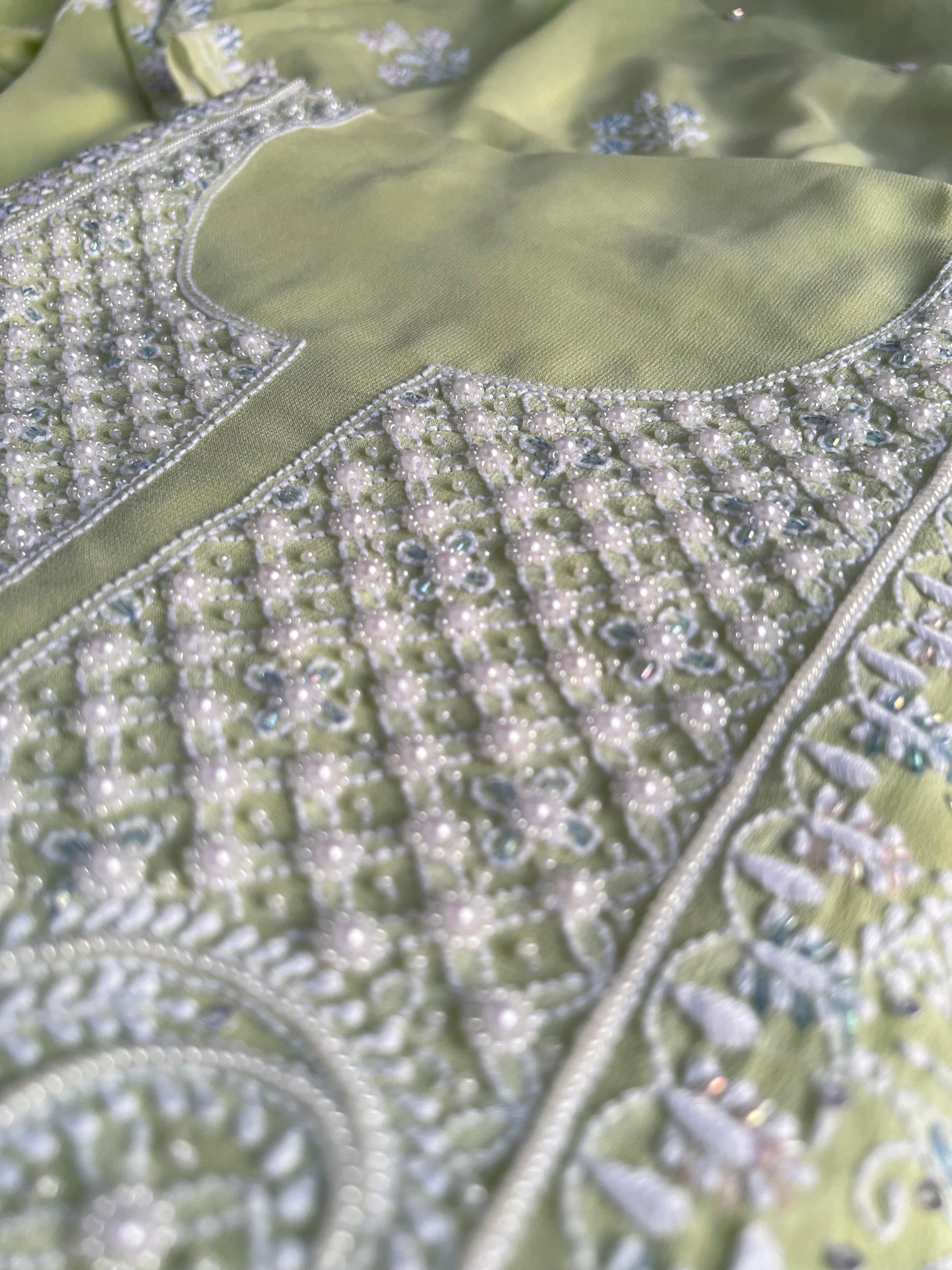 This pistachio green suit is adorned with delicate pearls, shimmering sequins, and intricate Hand embroidered Chikankari on pure georgette fabric.
