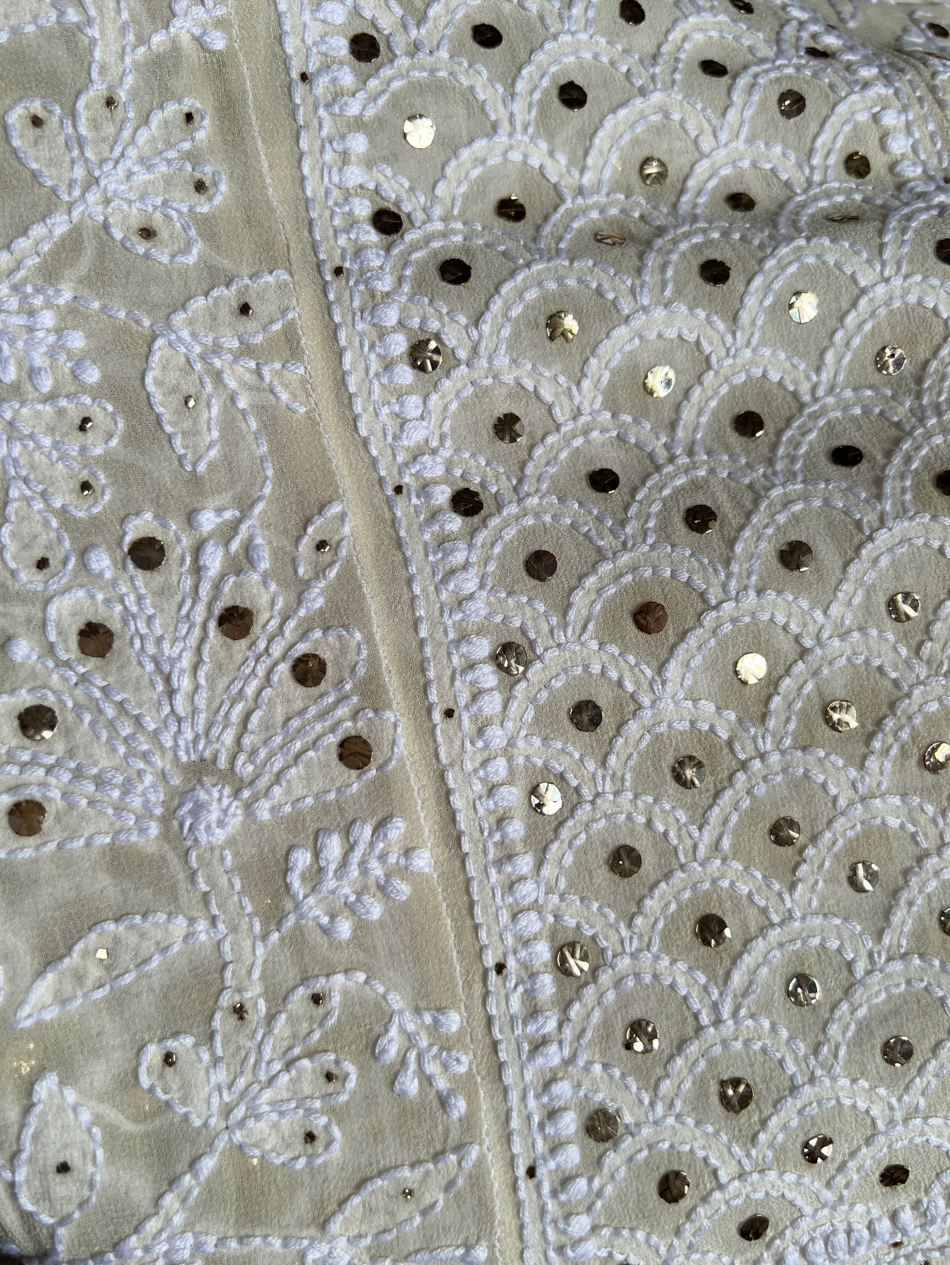 Work: Hand-embroidered Chikankari with delicate Mukaish highlights
