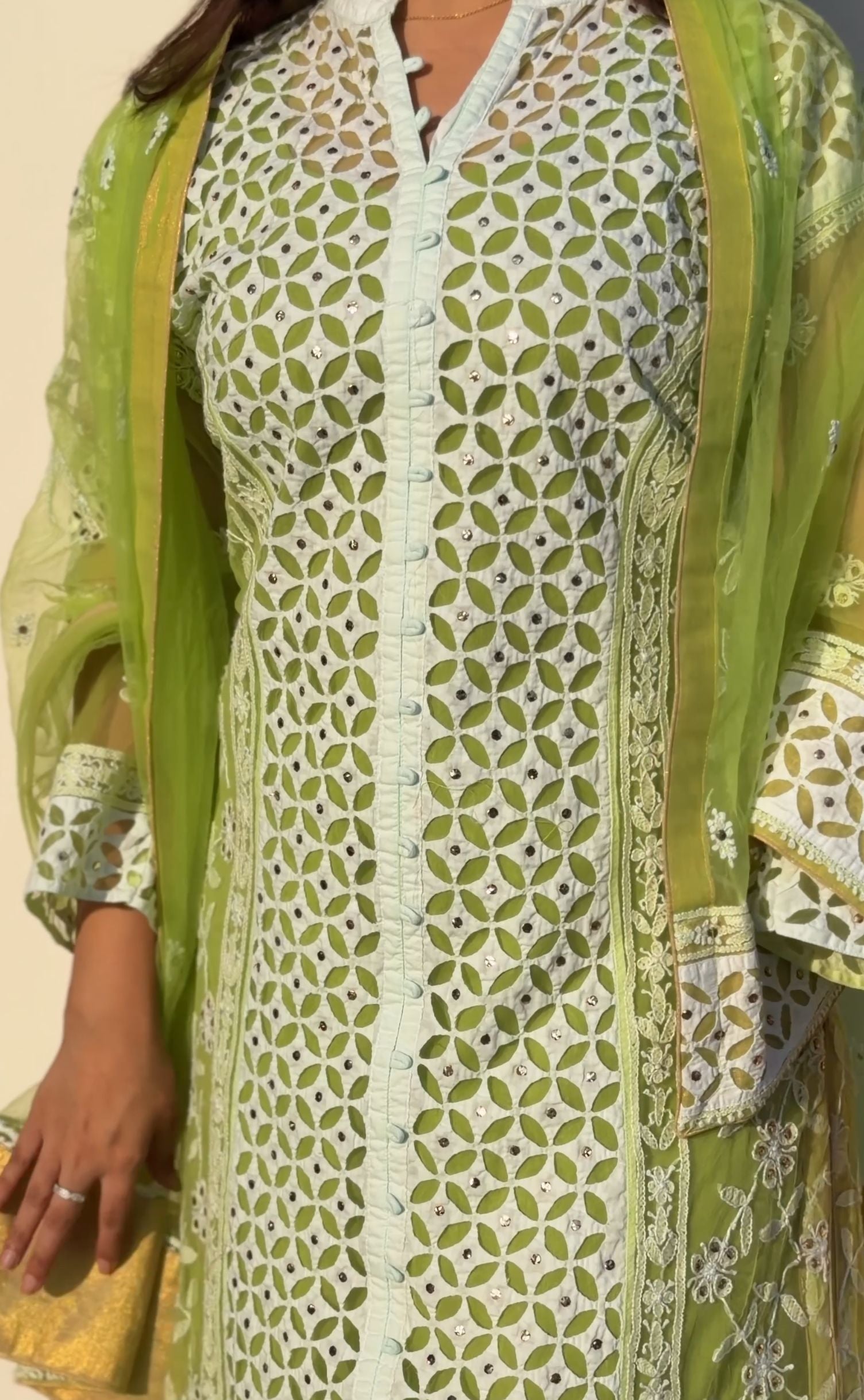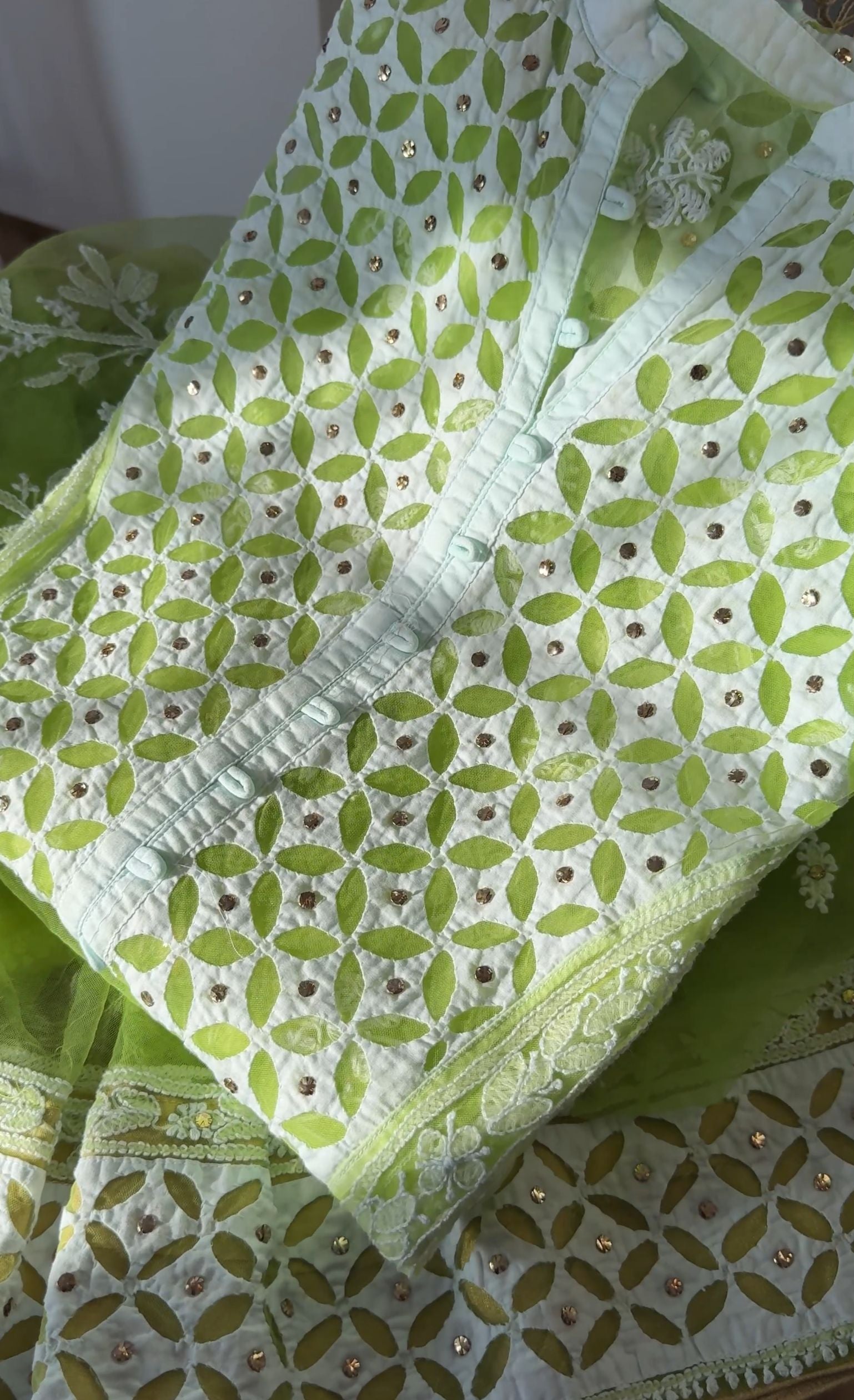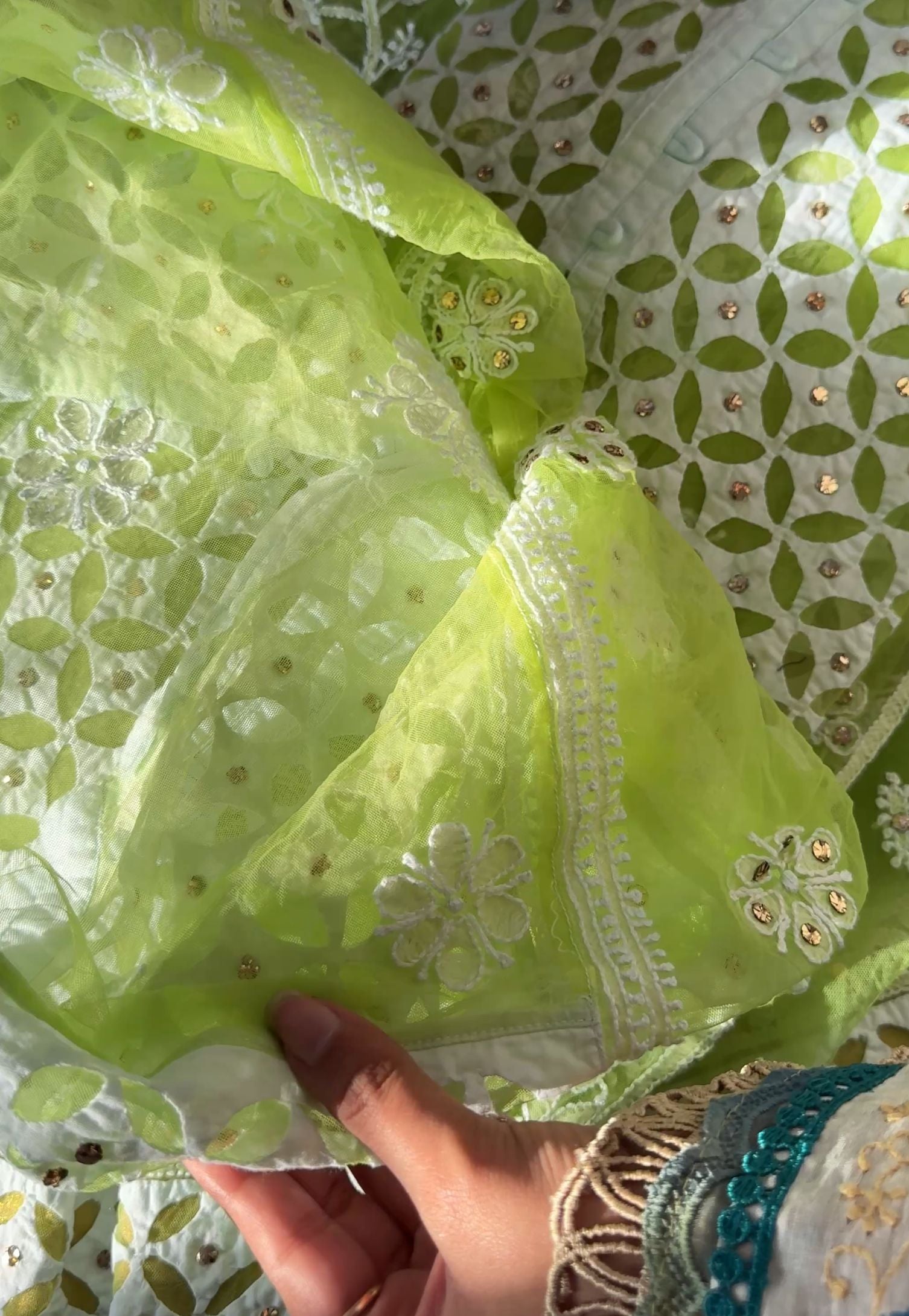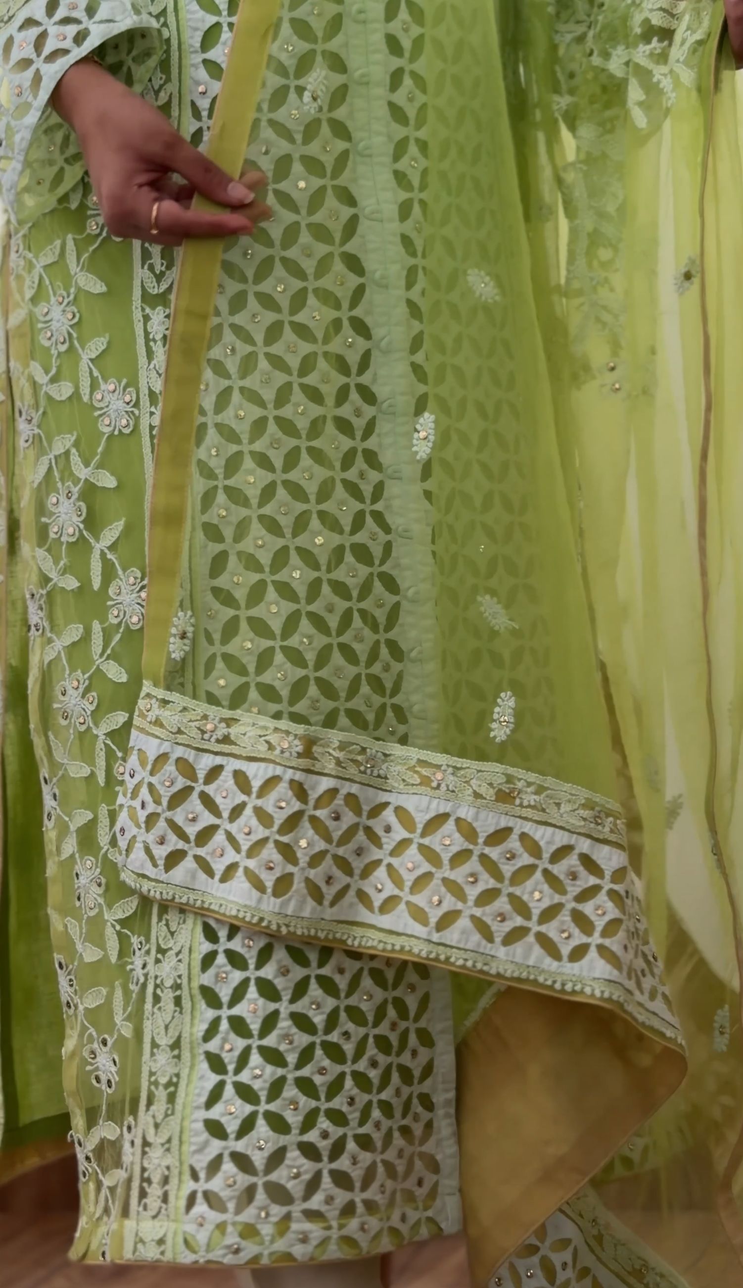 Elevate your festive wardrobe with this breathtaking lime green ensemble from ShaSumz. Crafted on a gossamer-light premium net, this suit is a masterpiece of Lucknow’s finest hand-embroidery techniques, reimagined for the modern woman.