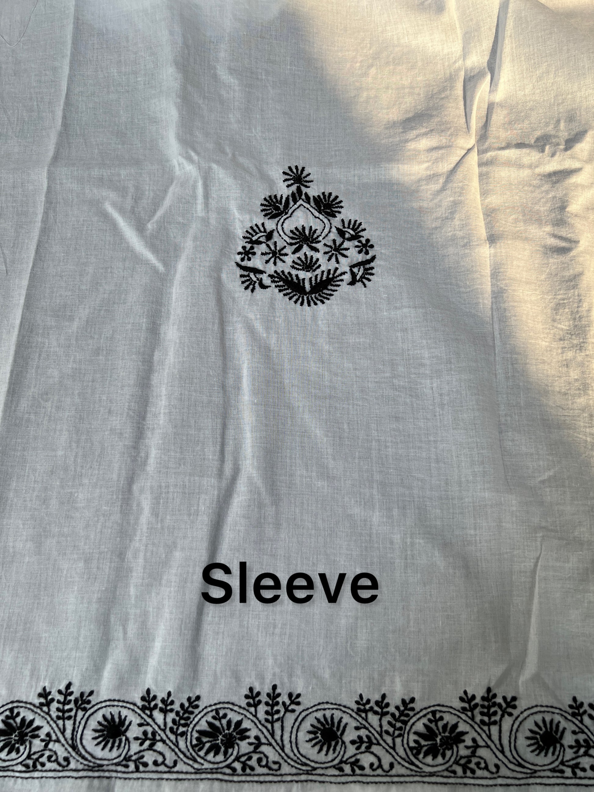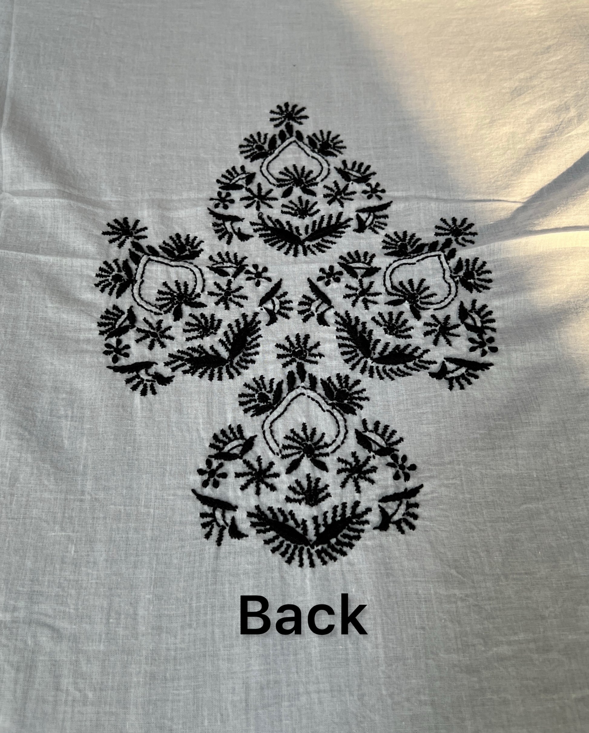 This monochrome kurta fabric is made from soft white cambric cotton and adorned with hand-embroidered black Chikankari. The clean palette allows the intricate needlework to take centre stage, creating a look that is both classic and contemporary.