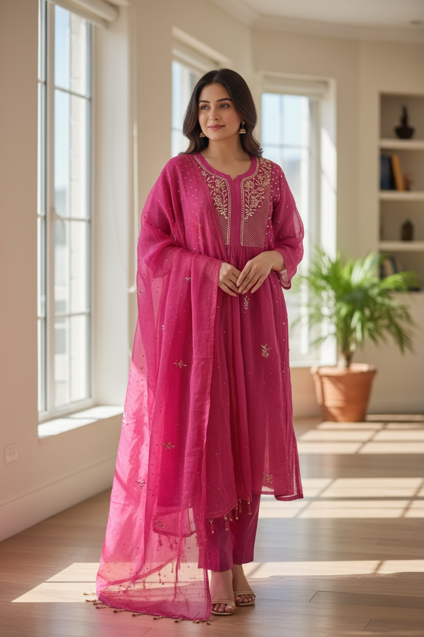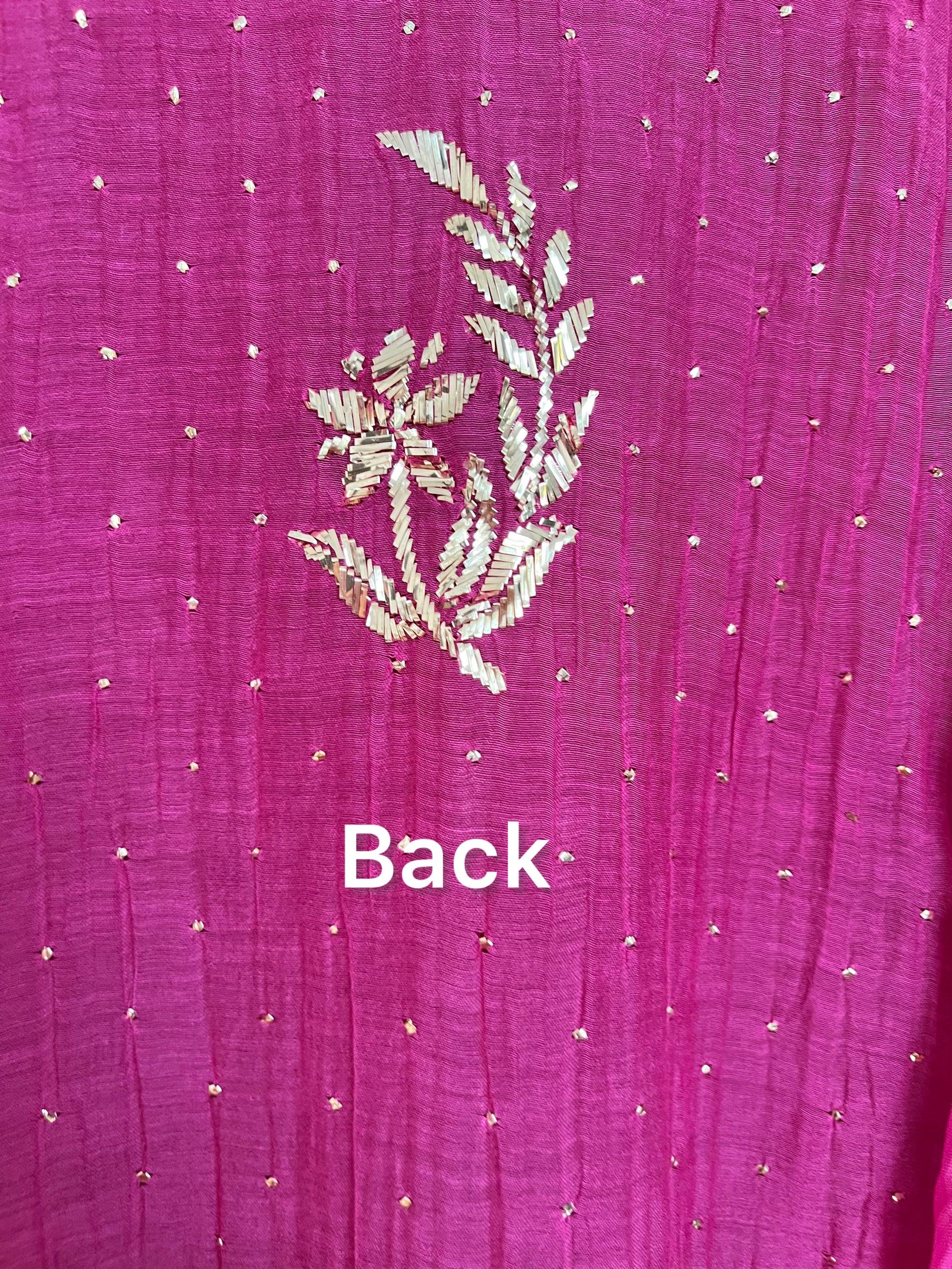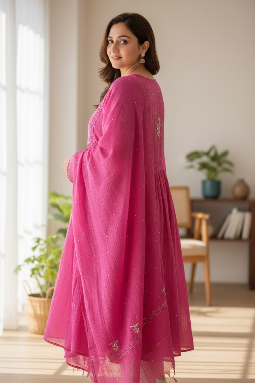 A timeless Magenta Mul Chanderi Bhopali Peshwaz embellished with hand-done Mukaish work. Lightweight, elegant, and perfect for festive evenings or intimate celebrations.