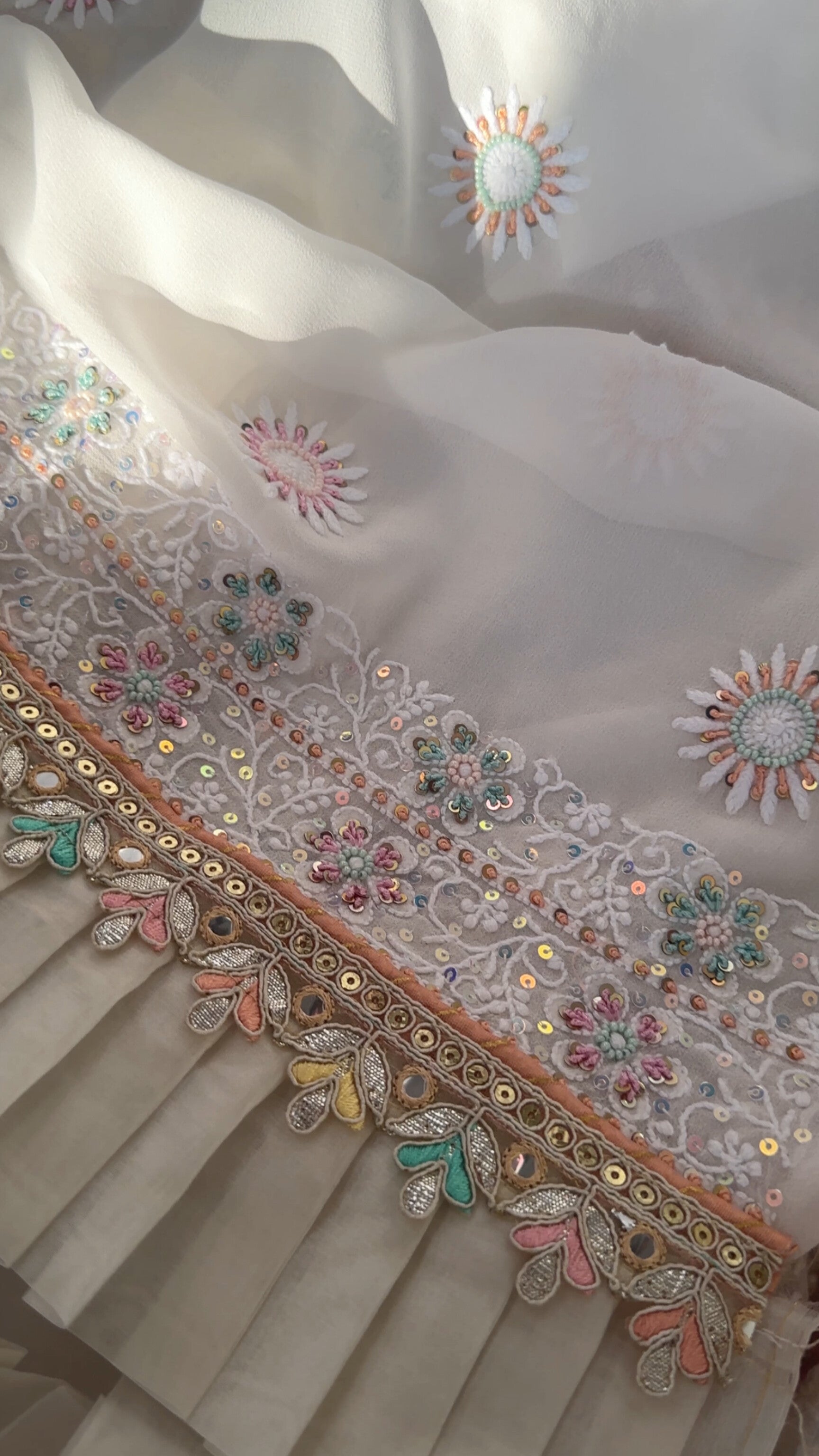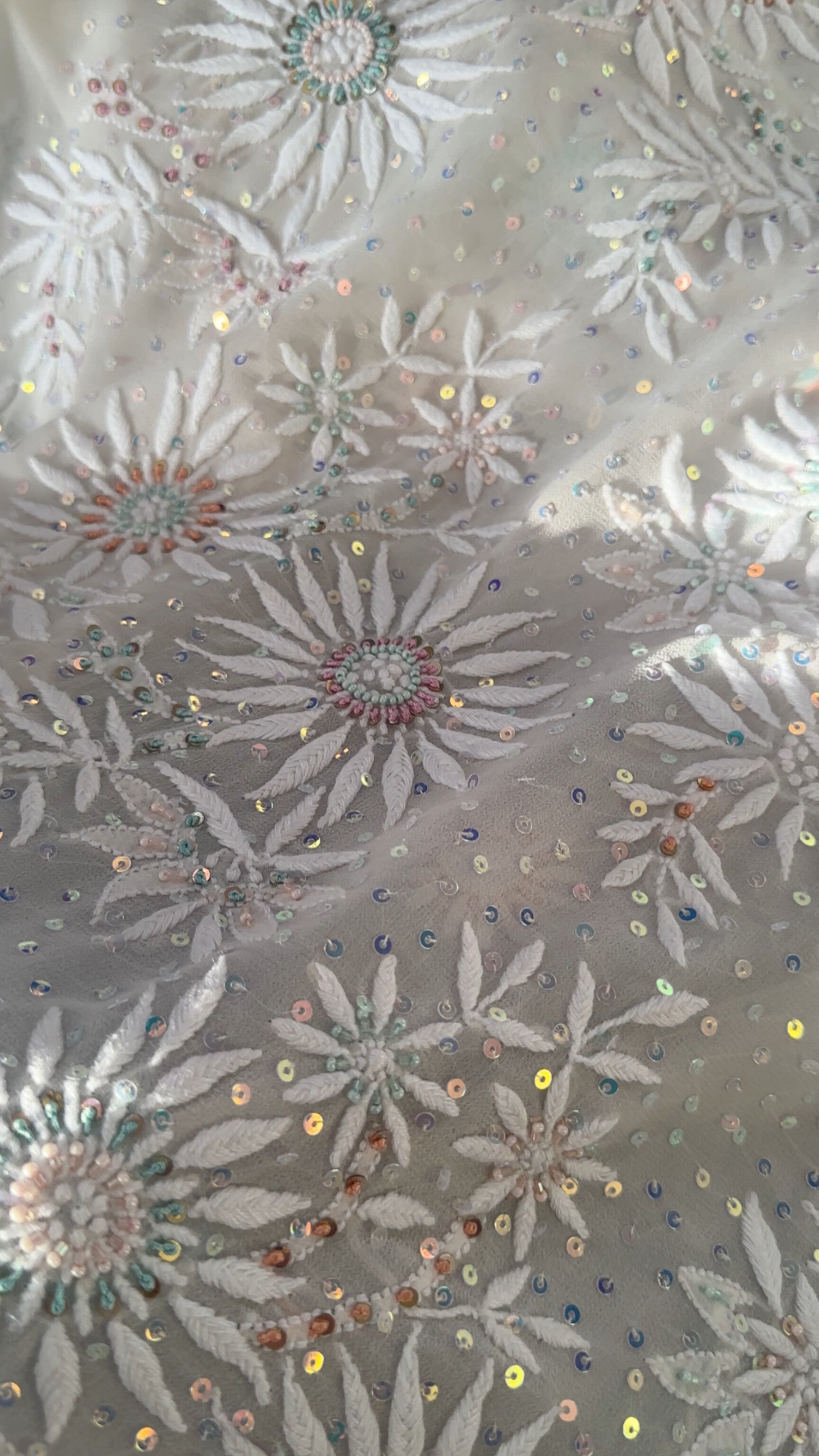 This expertly crafted Off White Chikankari and Embellishments Suit features delicate pearls, shimmering sequins, and multi color Resham French knots. This stunning Pure Georgette suit is perfect for special occasions or formal wear. Made with intricate detailing, this suit is a must-have for any fashion-forward wardrobe.
