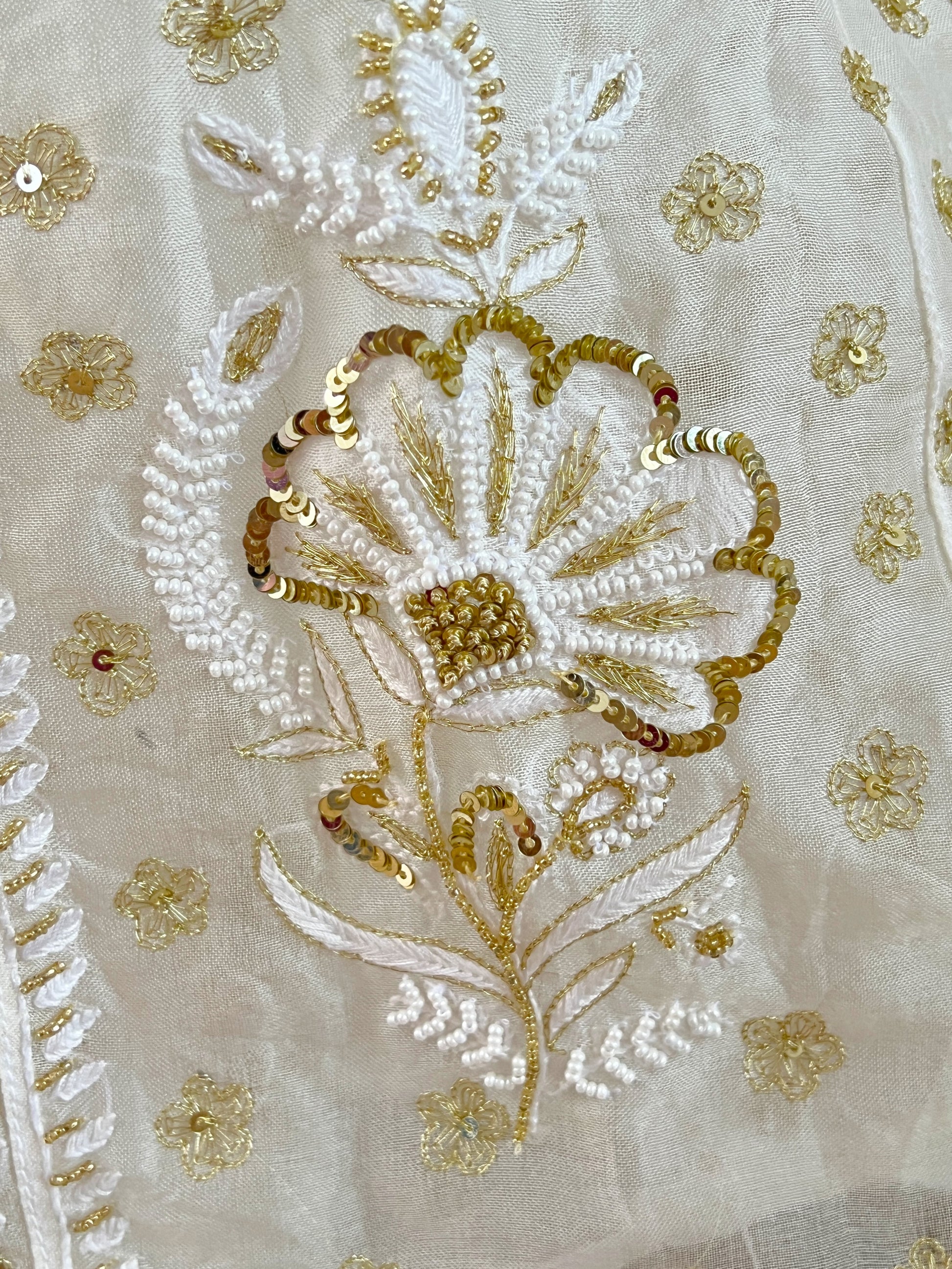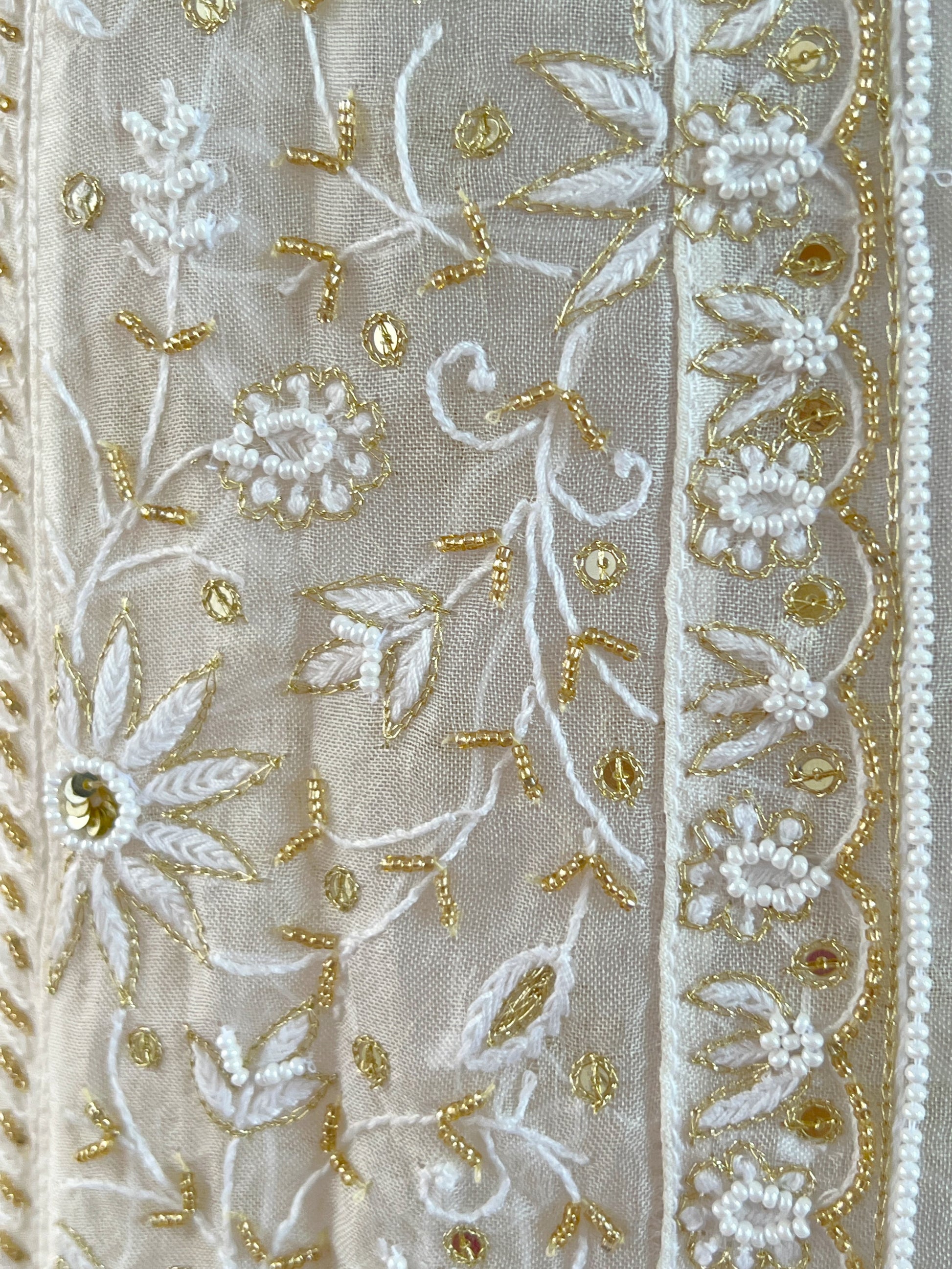 Craftsmanship: Intricate hand-embroidered Chikankari patterns with All-over embellishments using Zari, Sequins & Pearls, individually handcrafted