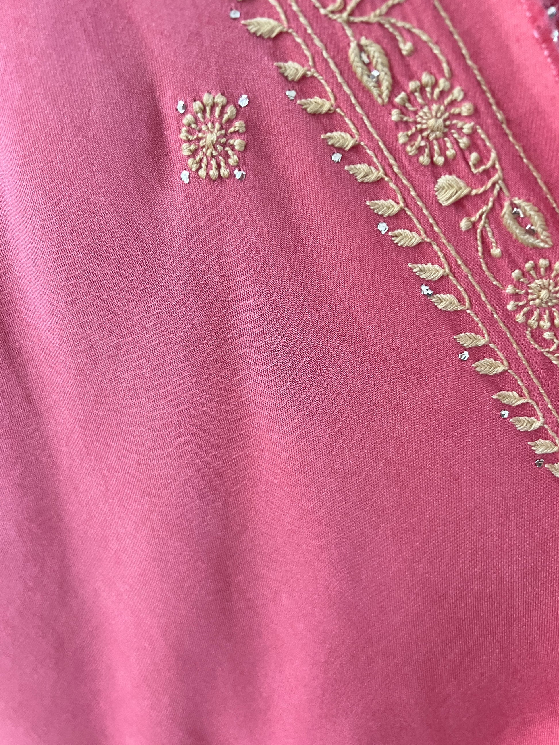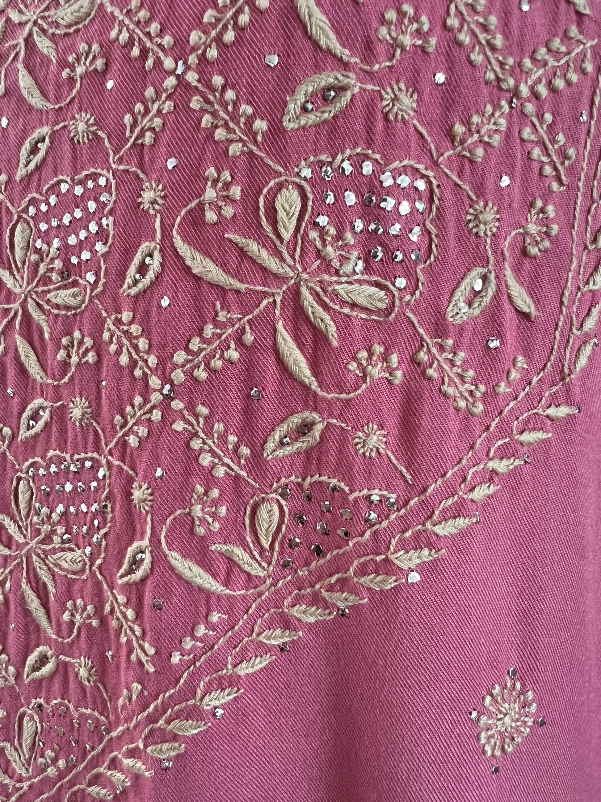 The feather-soft Pashmina fabric drapes beautifully, providing warmth without weight, while the intricate embroidery adds depth and sophistication. Delicate beige thread Chikankari is thoughtfully enhanced with the soft metallic shimmer of Mukaish Kamdani, creating a harmonious balance of texture and glow.