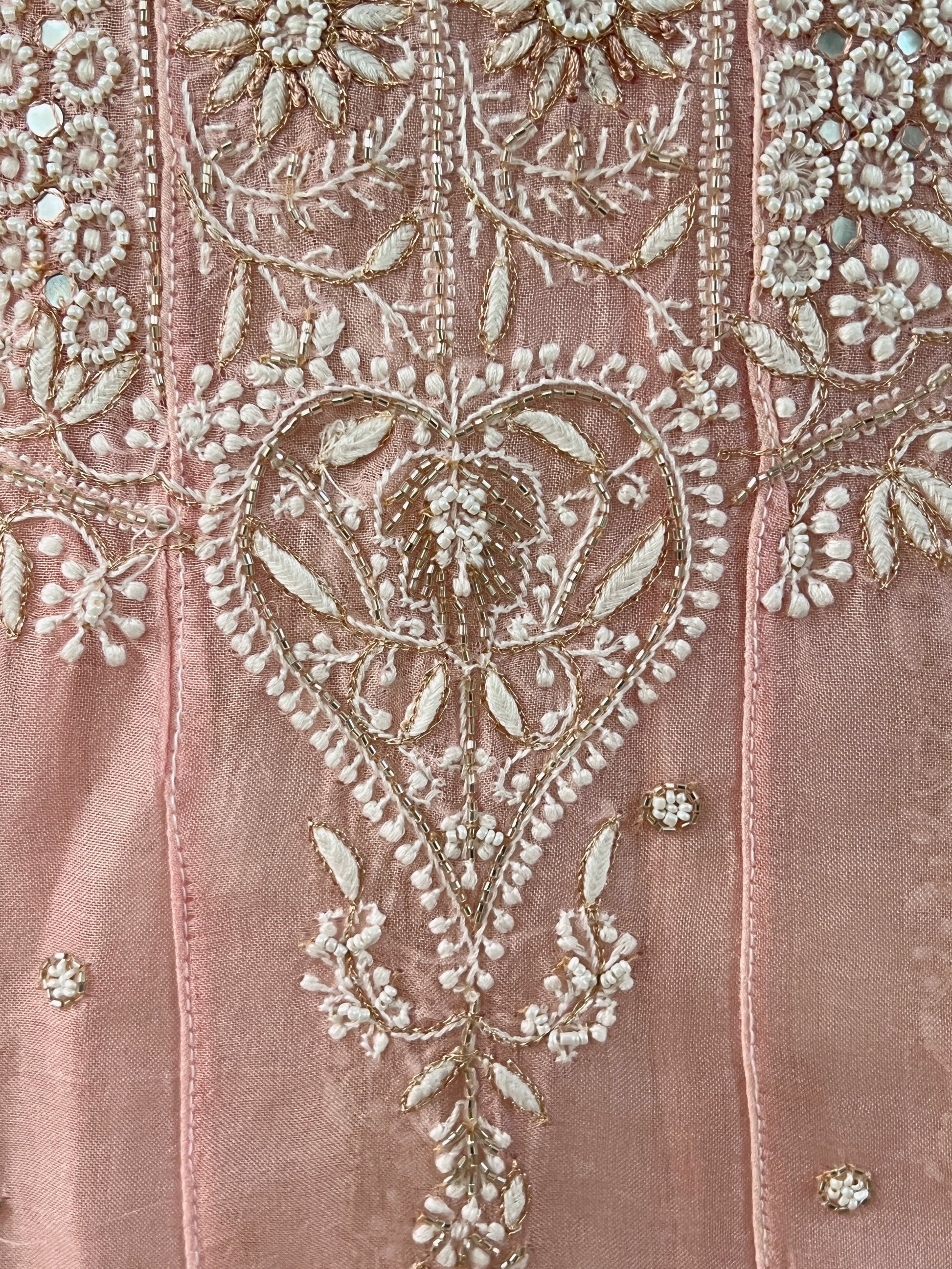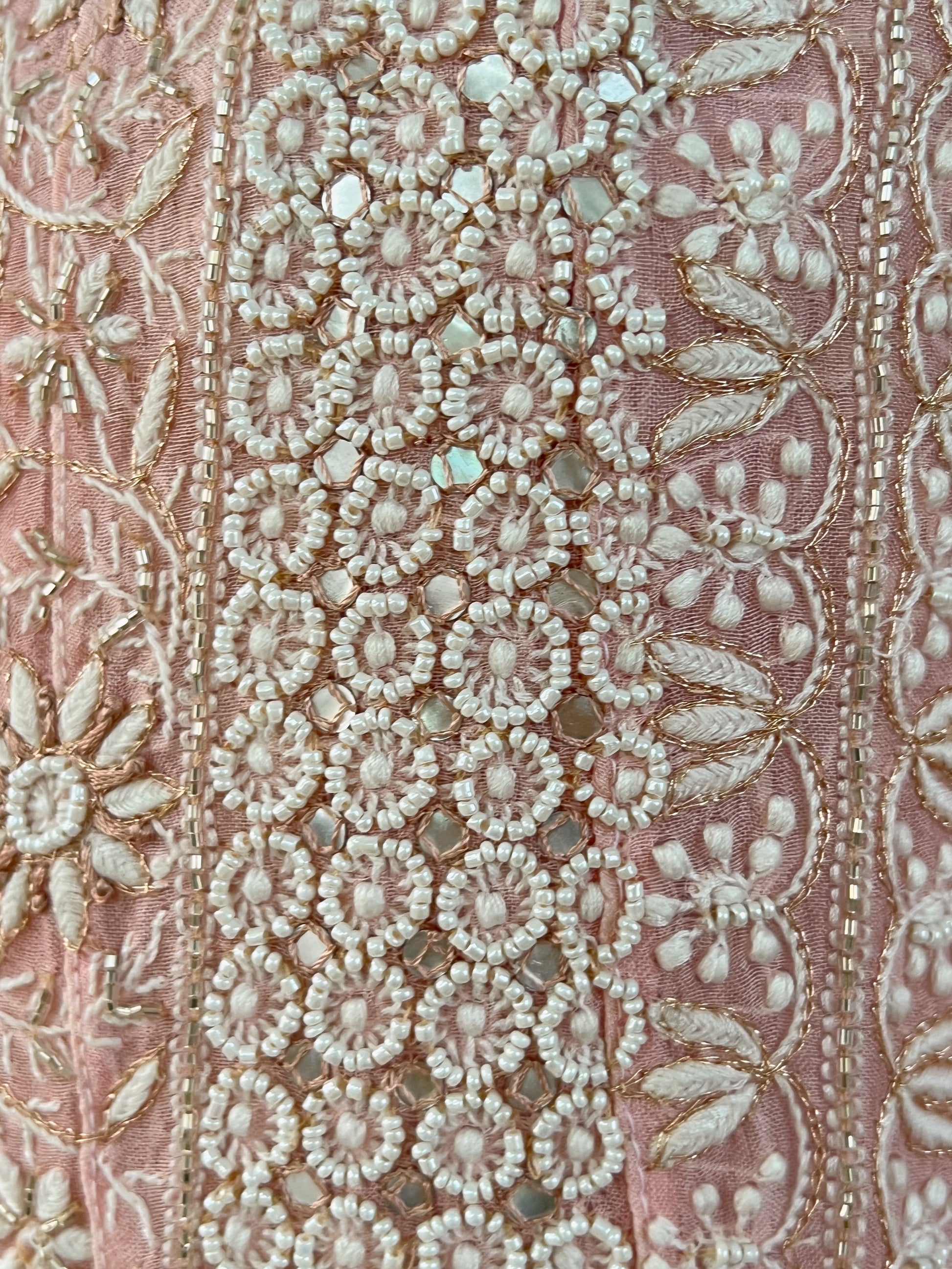 Craftsmanship: Intricate hand-embroidered Chikankari patterns with All-over embellishments using Zari, Sequins & Pearls, individually handcrafted