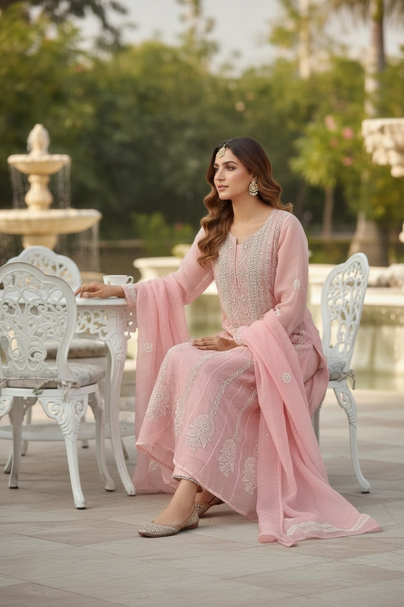 Pink Pure Organza Silk Anarkali – Hand-Embroidered Chikankari & Luxe Embellishments